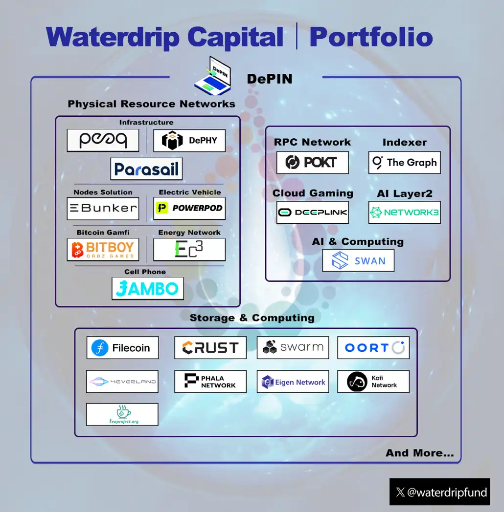 DePIN 赛道涵盖了广泛的类别,包括存储、计算、数据收集与共享、通信技术等。每个领域的现有市场都呈现出不同程度的竞争现状。在 2020 到 2022 年的牛市周期中,去中心化存储和计算赛道一直是加密市场的宠儿。Waterdrip Capital 基于这一趋势,有幸在早期战略性地布局了许多在现在被归类到 DePIN 的项目,积极参与并推动这一领域的发展。然而,尽管 DePIN 展示了巨大的潜力,其发展也面临许多局限性和挑战,但也同时存在挖据到优质标的的机会。