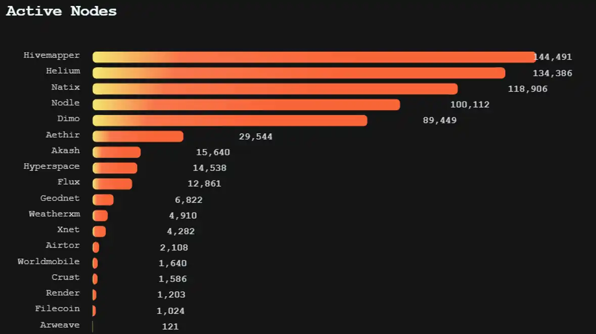 以下是截止目前活跃节点数数据,Hivemapper,Helium 和 Natix 位列前三,均已经在全世界部署了超过 10w 的节点。