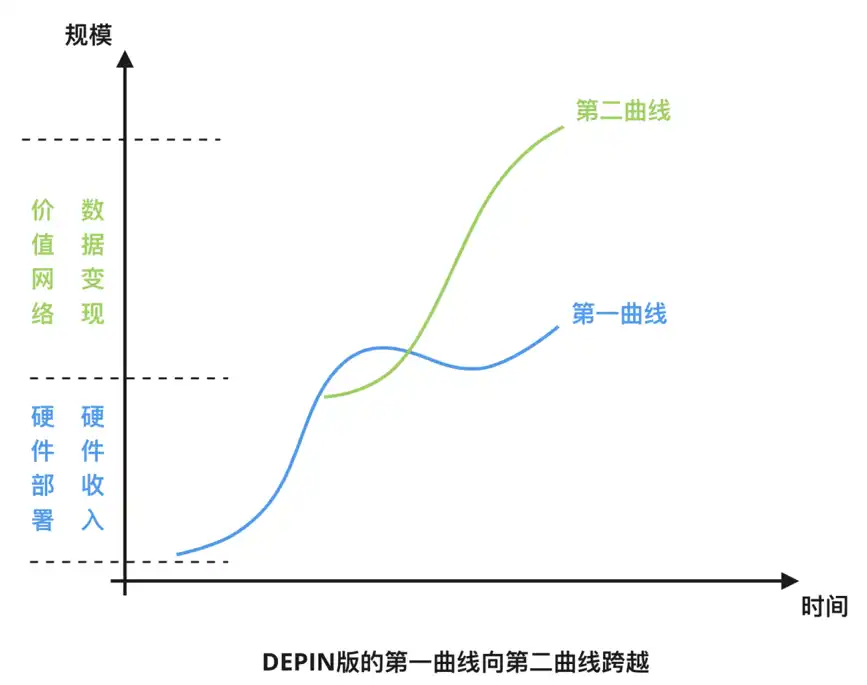 从此前成功的 DePIN 项目经验中已经可以看出,DePIN 的业务逻辑天然地指向了以硬件售卖作为项目发展的第一曲线,数据价值网络变现叠加在第一曲线之上,作为发展的第二曲线的指导思想;