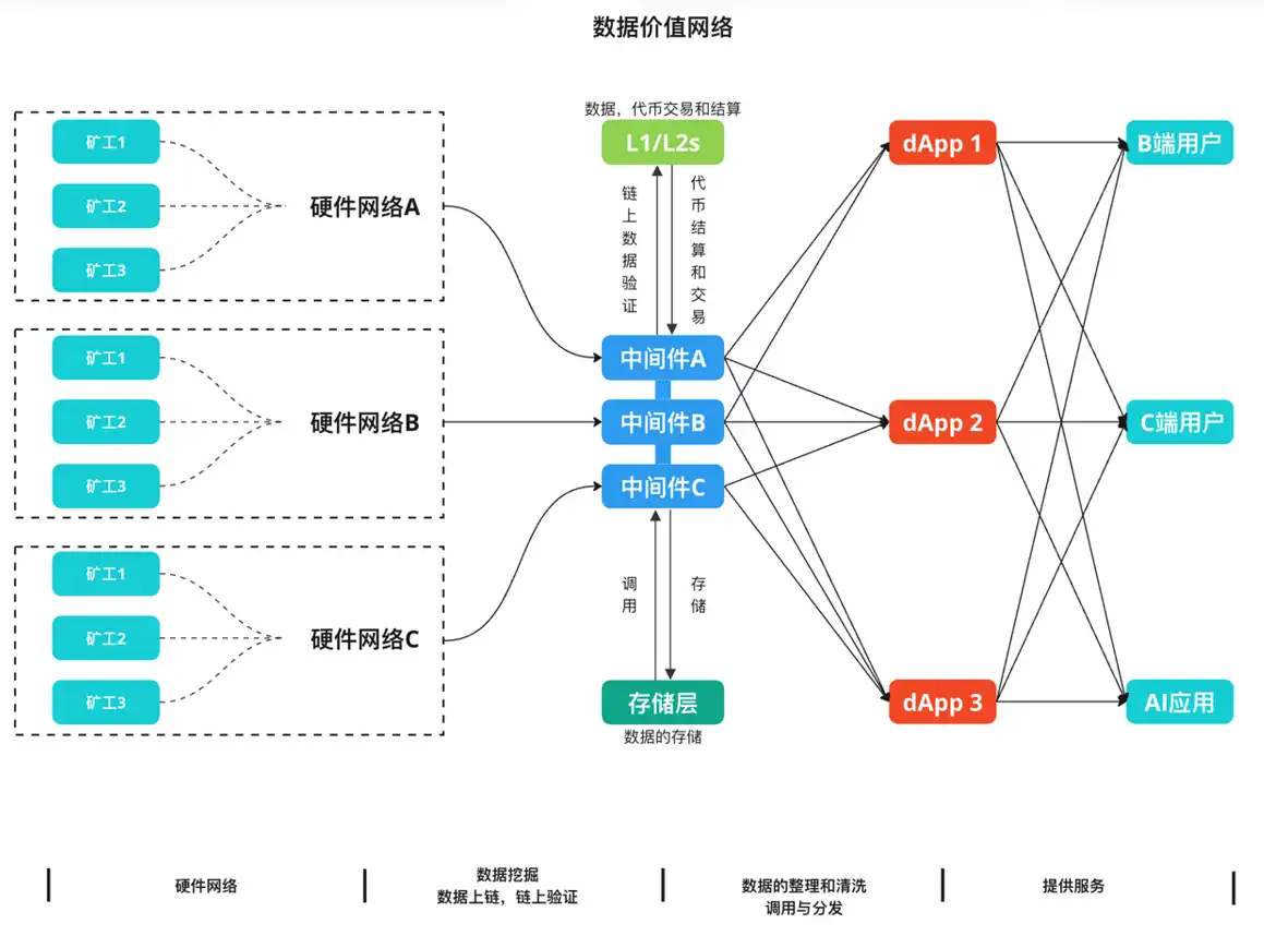 DePIN 通过聚合一系列的价值链路,拆分中心化的供给侧,并利用公链聚合多个需求侧,最终形成 DePIN 模式下的数据价值网络。
