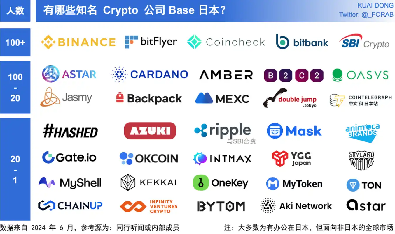 · Binance 在 22 年,通过借壳收购了日本合规交易所 SEBC,在 23 年下旬更名为币安日本站,正式开启了日本合规业务,同年与日本头部银行 - 三菱 UFJ 信托银行,建立了合作,计划发行日元稳定币。受 2023 年,新加坡工作签证收紧、美国监管政策等影响,一些没有获得海外工作签证的员工,被分到了币安日本站,自此币安东京办公室,开始了大规模扩张之路。