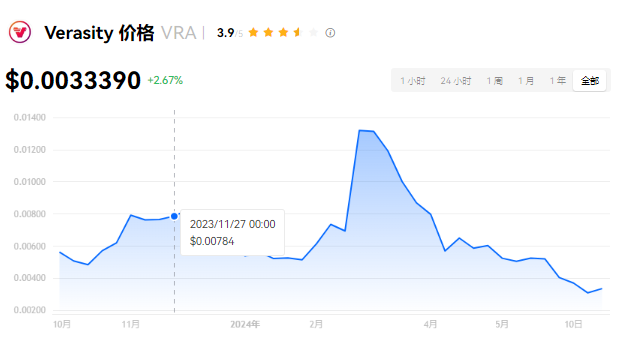 Verasity 当前价格为 $0.0033390。Verasity 的价格在过去 24 小时内上涨了 2.68%。目前,Verasity 市值排名为第 234 名,实时市值为 $3,320.46万,流通供应量为 10,001,381,139 VRA,最大供应量为 99,001,381,139 VRA。我们会实时更新 Verasity/USD 的价格。Verasity 价格表现 (美元)