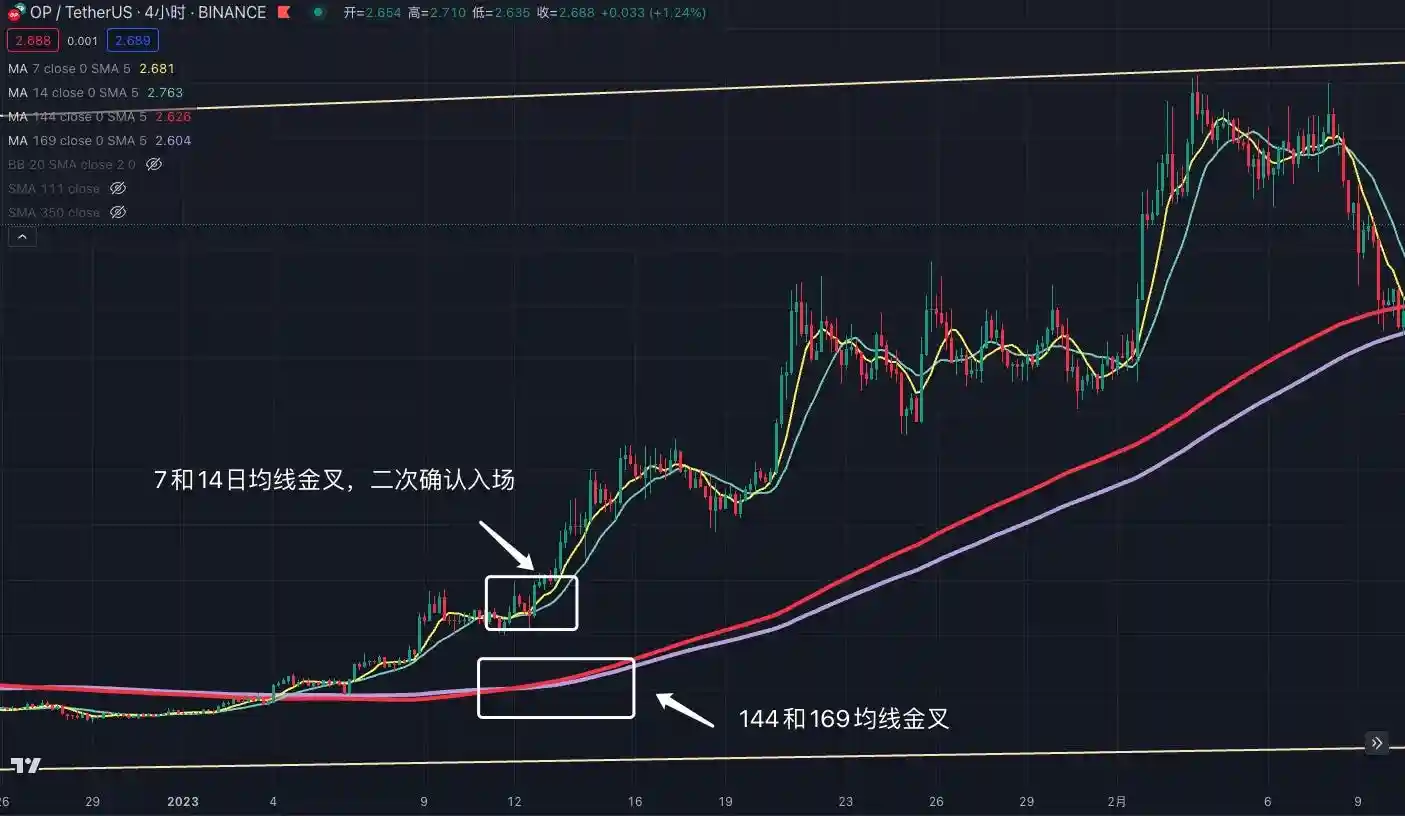我们以 OP 的四小时走势举例,我们发现 144 日均线上穿 169 日均线时,形成金叉(金叉则代表 144 均线上穿 169 均线),即代表中长期看涨,可以尝试入场,而价格到顶部时,144 均线下穿 169 均线,形成死叉(死叉代表 144 均线下穿 169 均线),则中长期出场观望。