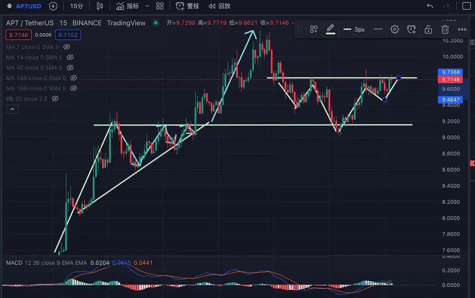 我们以 APT 的 15 分钟走势为例,其走势就标准复刻了上图的第三种和第十种走势。不过需要注意,这只是成功案例,很多主力和庄家会故意做出类似图形来骗人上车,我们需要注意甄别,或者及时止损。