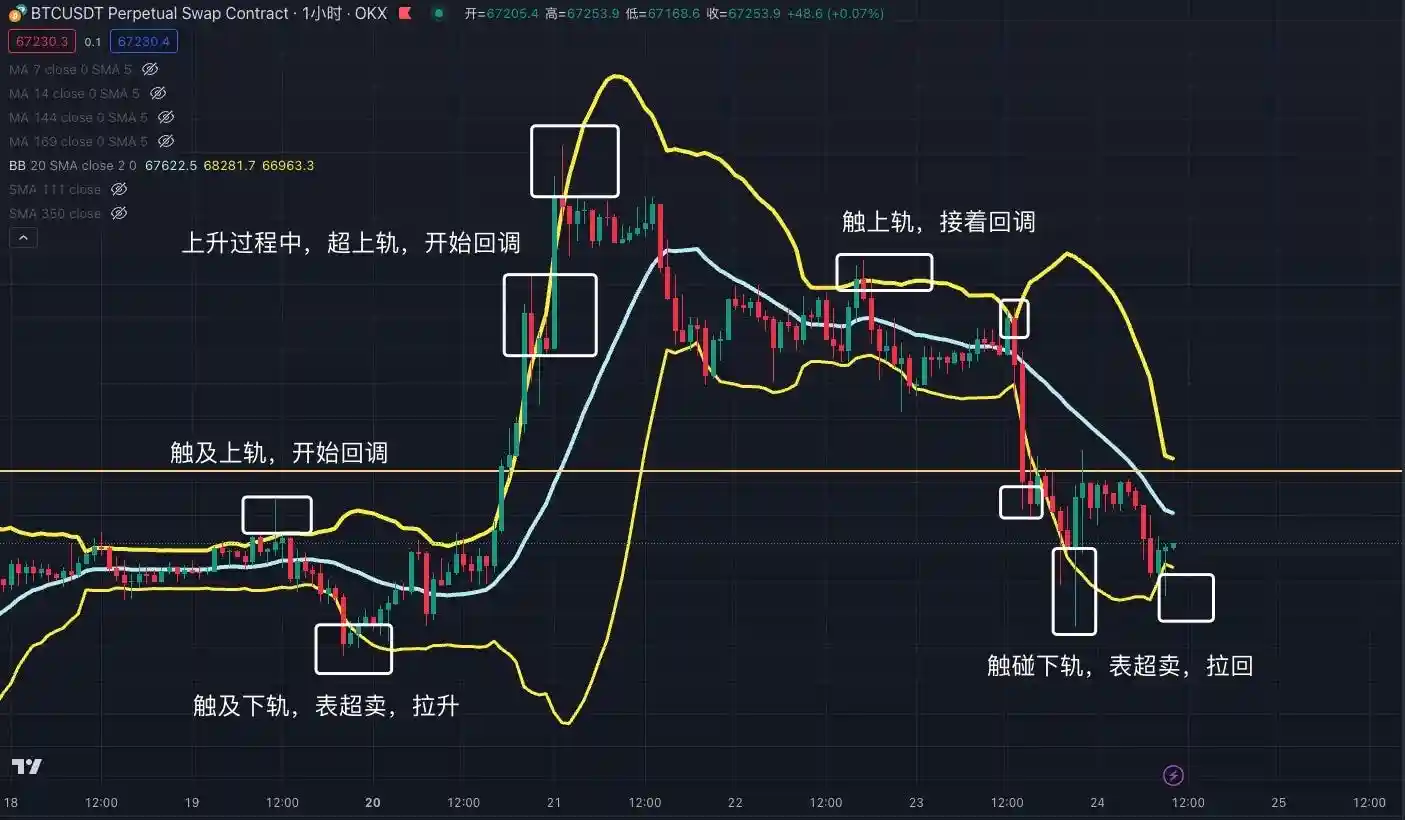 我们以 BTC 的一小时走势举例,BOLL 主要分为三条线,分别为上轨,中轨,下轨。当价格超过上轨时,即代表超买,回调的概率较大,当价格跌出下轨时,即代表超卖,拉回的概率较大