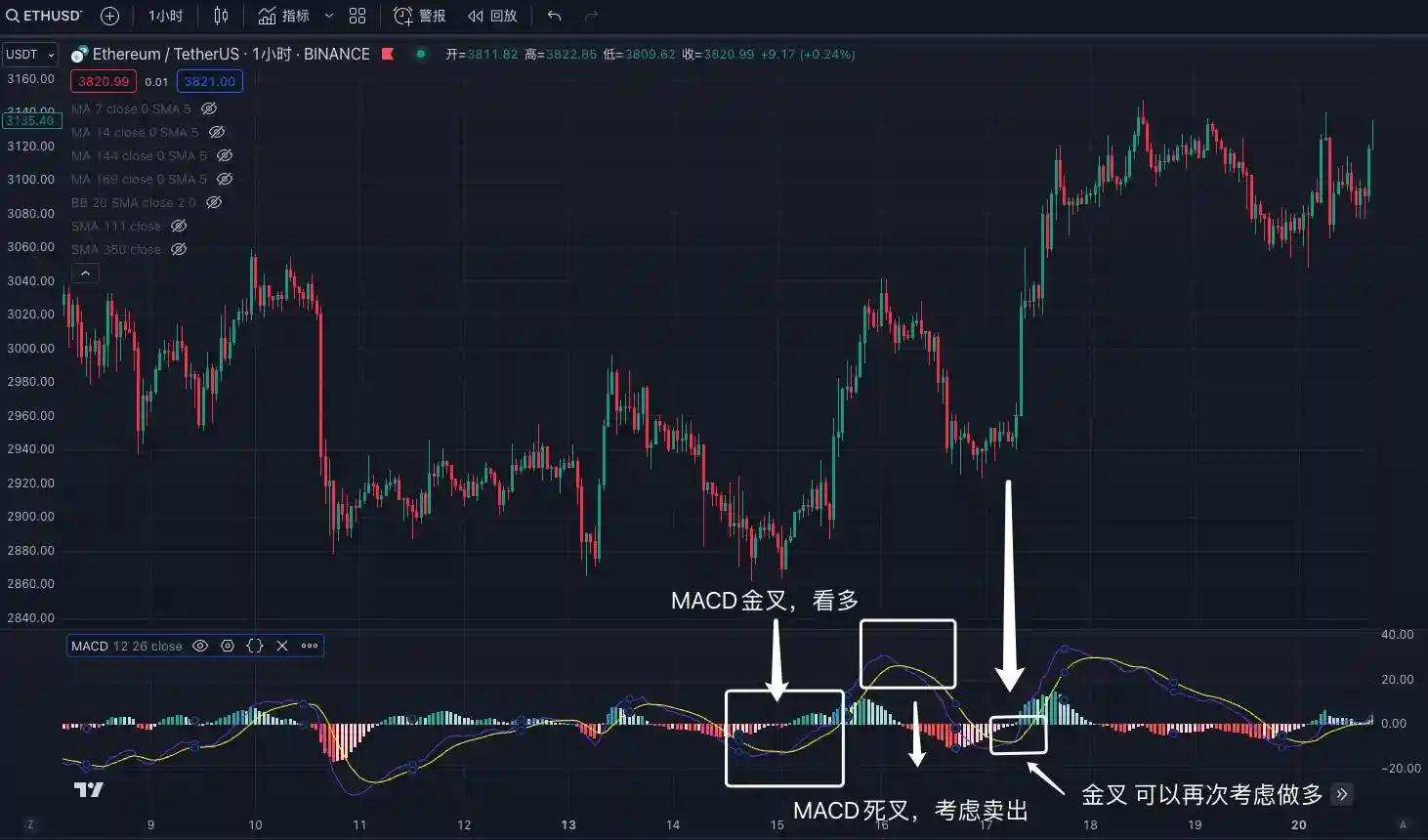 我们以 ETH 的 4 小时走势举例,当 MACD 线穿过信号线时,则代表行情看涨,当信号线穿过 MACD 线时,则代表行情看跌。同时 MACD 适用于各时间段,无论长线还是短线,无论 1 分钟级别还是周线级别,依旧适用。