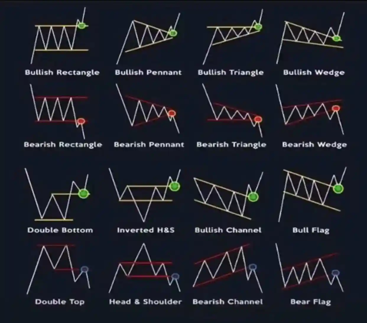 旗形整理也叫三角形整理,该整理并非指标判断,而是 K 线上的走势变化去判断,我们可以总结为 16 种常见基本的变化类型,如果看到类似走势可以买入,一般成功率很大,后续看涨,不过也有失败的时候,建议在旗形的低点购买,当突破三角形区域上涨时,突破区域变成支撑位置,后期下跌可以在支撑附近介入。