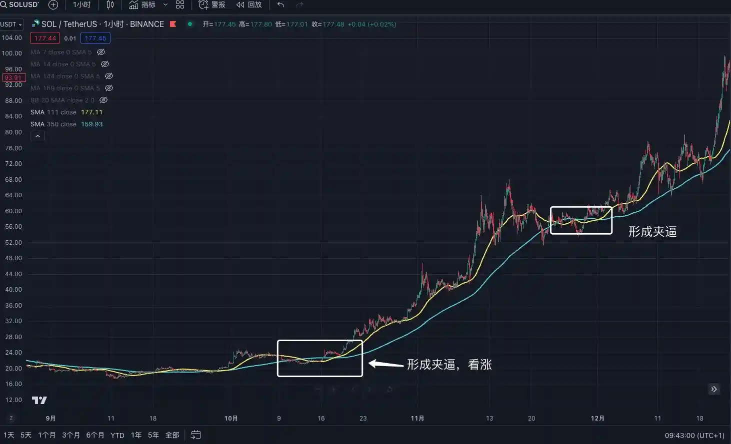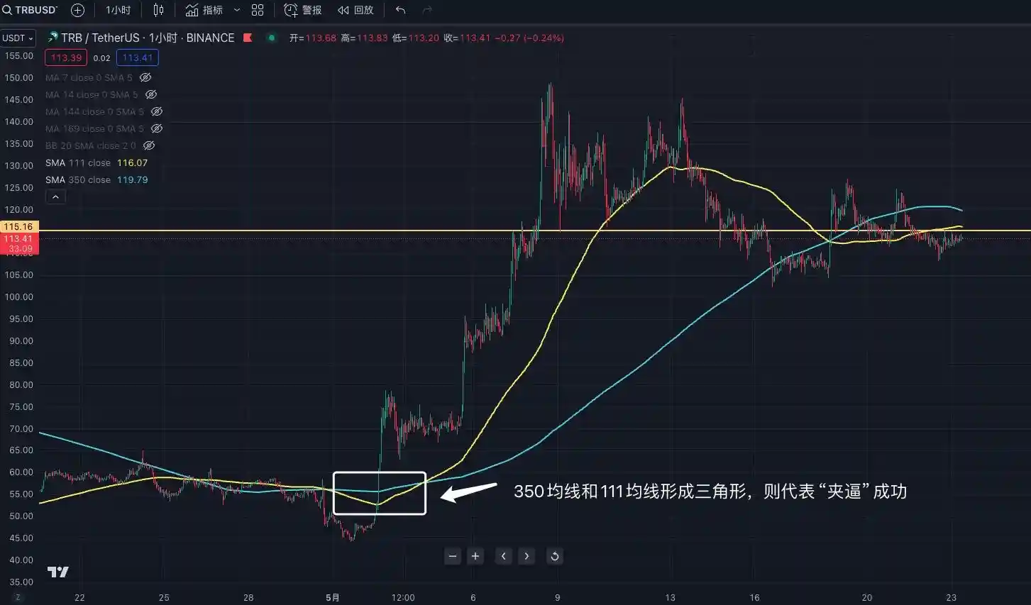 我们以 TRB 的 1 小时走势举例,当蓝线(350)均线在上,黄线(111)均线在下,形成类似或近似三角形形状时,则代表「夹逼」成功。成功后,后期走势看涨,不过需要注意是,一个正确的「夹逼」形态,111 均线必须穿过 350 均线,如果只有一边穿过,则不成立。