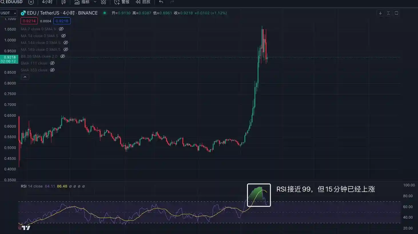 我们接着以 EDU 的 4 小时走势为例,RSI 突破 70 之后,持续上涨,RSI 最终达到 99。因此我们无法通过 30 抄底 70 卖出的方法来。我们需要判断股票/币种的性质,是否为小市值,MEME 类币种,或者高控盘币种。相比于蓝筹币种,其他小币的 RSI 判断可能需要提升到 90 和 10 范围,而并非 30 和 70,这需要通过自己判断。