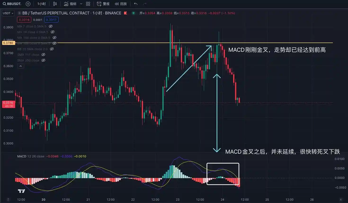 假走势主要是通过 MACD 金叉来引导新手入场,以 BB 的 15 分钟走势为例。当 15 分走势突破新高后,转而快速下跌,MACD 进入死叉,即代表开启回调,可是在回调当中,其走势正在快速收回,甚至逼近前高,但这时 MACD 却刚刚开始金叉。我们可以理解这种走势为「心有余而力不足」,即价格已经反弹达到前高,而 MACD 却刚刚金叉。 这种走势 80% 以上的结果都会跟这幅图一样,硬气没一会就软了。
