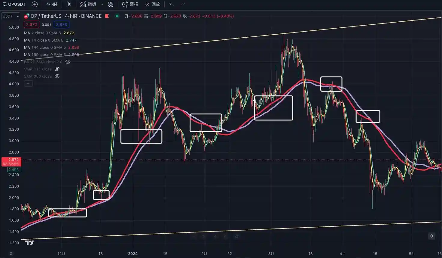 这里我给出的建议是,由于 144 均线和 169 均线并无法判断短期的走势,滞后性较强,所以在此基础上可以添加 7 和 14 日均线用于辅助判断短期走势。让我们再放大 op 的走势,通过大级别的 MA 均线判断中长期行情变化,再通过小级别的 MA 均线金叉进行二次确认,可以将确定性做到最高。