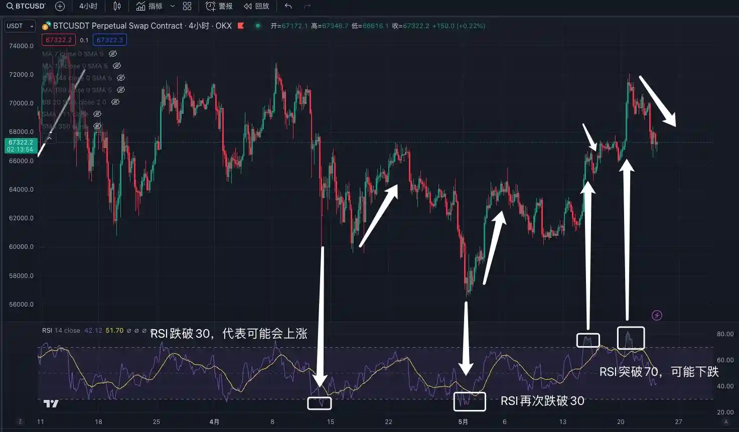 我们以 BTC 的 1 小时走势举例,当 RSI 跌破 30 时 11,即代表需横盘和回调,而这种回调并不绝对,只能代表市场行情很弱,无法作为直接买入依据。其次当 RSI 突破 70 时,即代表超买,可能会有回调风险。但这依旧无法作为买卖依据,只能作为辅助判断。 注意:极端行情下,RSI 可以达到 99 或者 1,所以不要通过 RSI 作为主要判断依据。