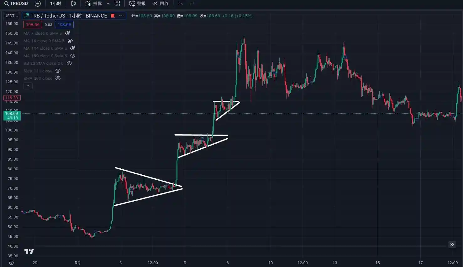 我们再以 TRB 的 1 小时走势举例,我们观察到 TRB 正是运用了三周旗形整理的走势,实现了一周三倍的上涨,所以当我们在市场再看到类似走势时,可以自己画出来用于验证。