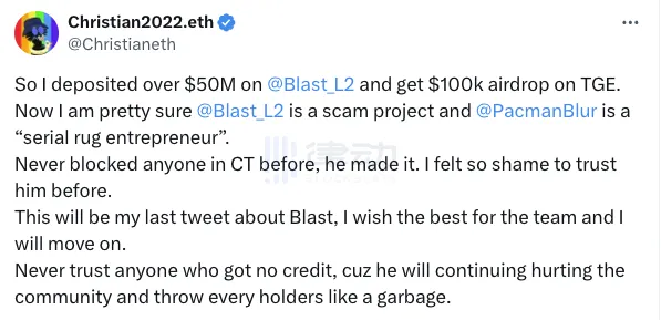加密基金 NDV 联合创始人 Christian表示自己在 blast 上存入超 5000 万美元,获得 20,912,000 枚 BLAST,价值约 54 万美元,但由于线性解锁目前只能领到 10 万美元的空投。Christian 将 blast 标榜为骗局项目,并将其创始人 Pacman 称为「连续 rug 企业家」。