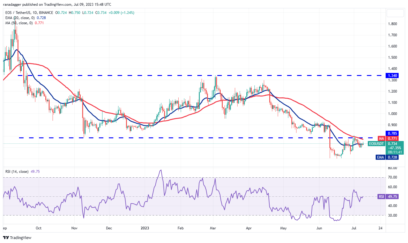 20 日均线(0.73 美元)已趋于平缓,RSI 接近中点,表明抛售压力正在减轻。买家必须将价格推高至 0.79 美元的上方阻力位,才能表明下跌趋势可能即将结束。随后,EOS/USDT 货币对可能会飙升至 0.93 美元。