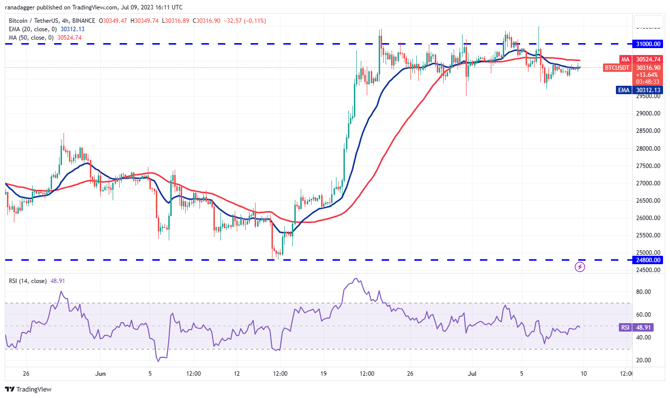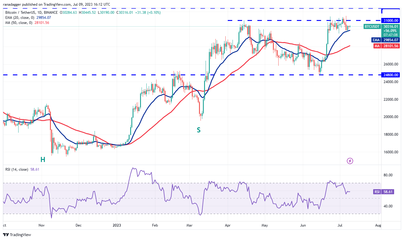比特币仍徘徊在 20 天指数移动平均线(29,854 美元)和上方阻力位 31,000 美元之间。这表明多头和空头对下一步走势存在不确定性。