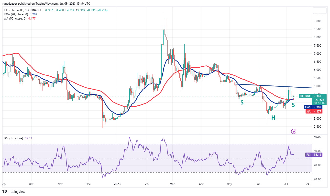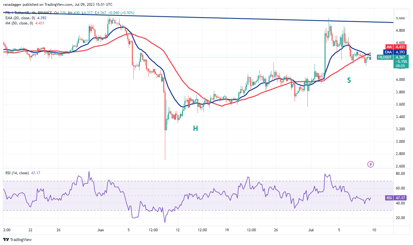fil币正试图形成反向头肩形态,该形态将在突破时完成,并收于颈线上方 5 美元附近。