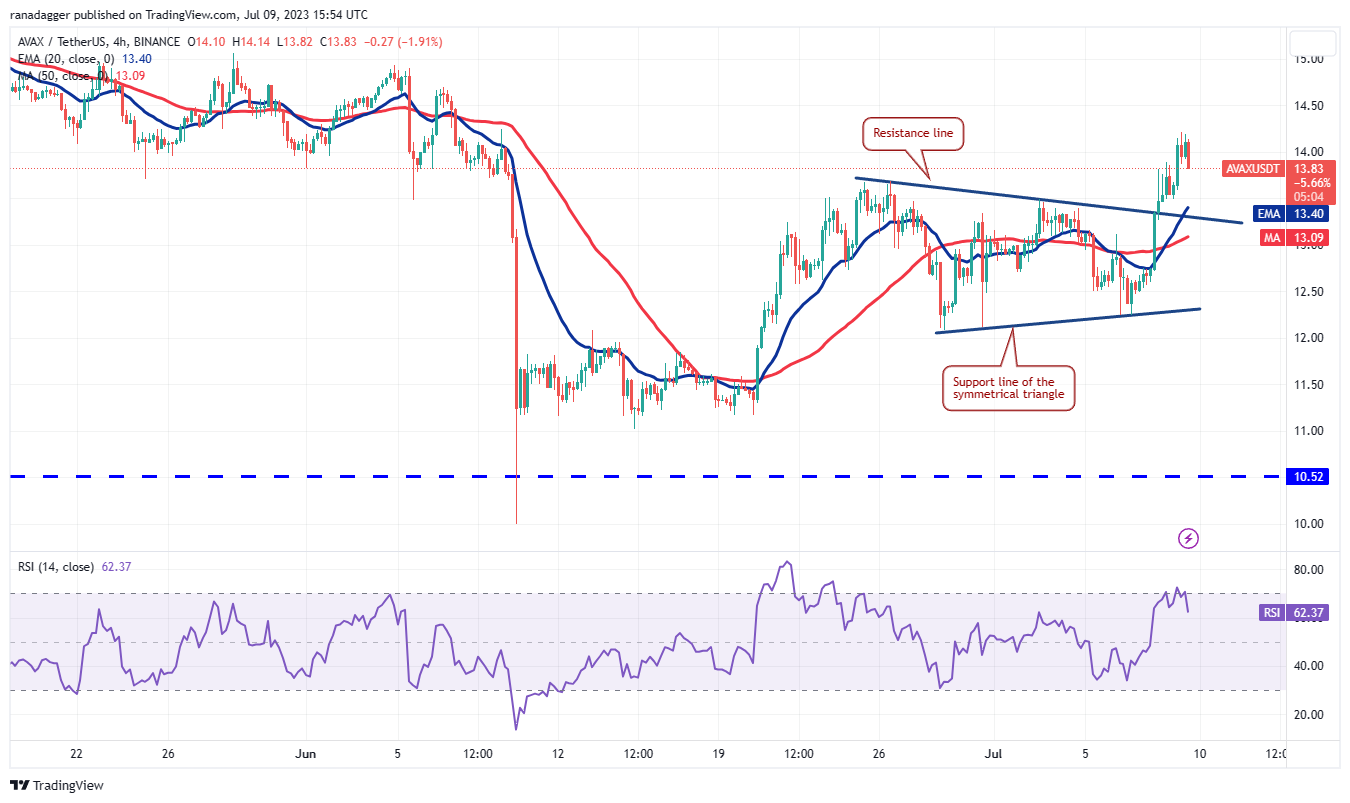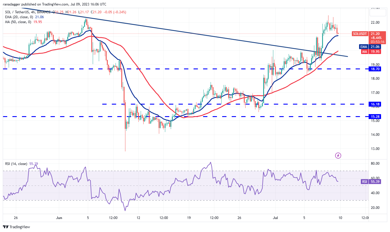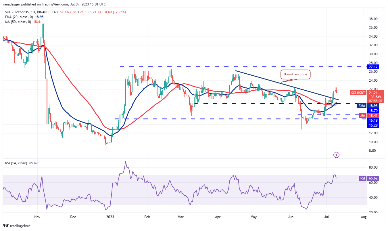 BTC/USDT 货币对于 7 月 7 日从 20 日均线反弹,表明多头继续积极捍卫该水平。买家将再次尝试克服 31,500 美元的阻力位。如果成功,该货币对可能会开始下一阶段的上升趋势。两人可能首先升至 32,400 美元,然后冲刺至 40,000 美元。