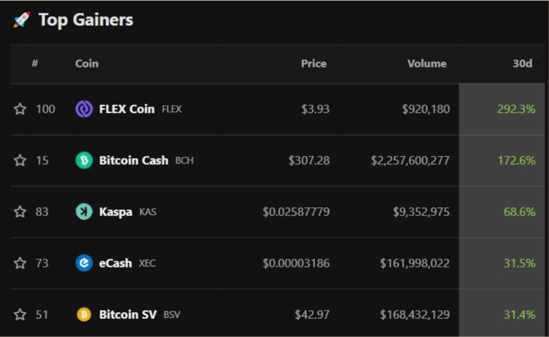 在 6 月份涨幅最大的股票中,三个比特币分叉占据了榜单,其次是 Kaspa 和 FLEX Coin (FLEX)。FLEX 受益于与 Open Exchange (OPNX) 的整合,后者得到了破产的三箭资本 (Three Arrows Capital) 基金联合创始人的支持。