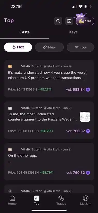 绑定完 Farcaster 账户后,可以在主页看推送流,寻找值得铸造的推文。Top 榜单包括最近交易次数多的推文和最新的推文,Trades 板块展示了推文交易的实时记录。
