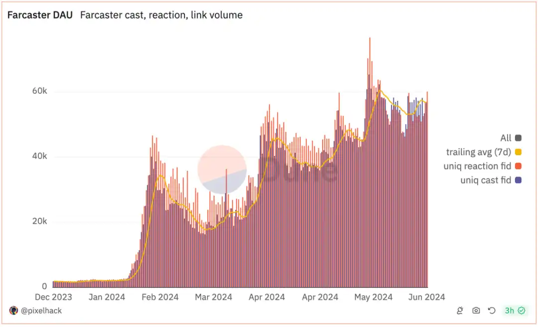 根据 Dune 数据显示,Farcaster 的总用户数量已经达到 54 万人,日活跃用户从年初的 2k 人激增至目前的 56k,实现了超过 28 倍的增长。