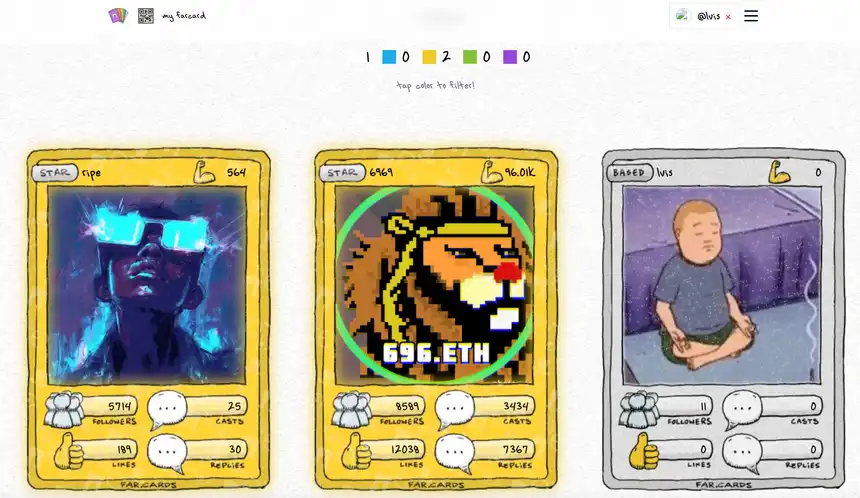 举例来说,far.cards 是一个基于 mint.club 开发的,专属于 Farcaster 用户的集换式卡牌项目,每位用户的卡牌属性值根据其在 Farcaster 上的活跃程度而定,比如粉丝数量,收到的赞和回复等。