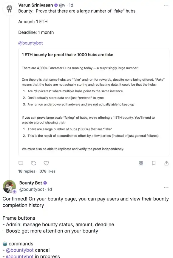 如下图所示,用户可以在 Warpcast 等客户端发送内容时加上 Tag @Bountybot 来发布任务,其他用户则可以领取对应的任务,获得对应的奖励。