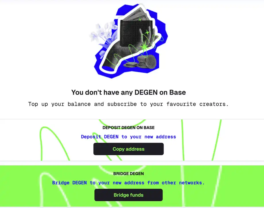 $Degen 是平台的消耗代币,开始使用 AlfaFrens 时,用户需要准备一些$Degen 存入平台生成的钱包内。