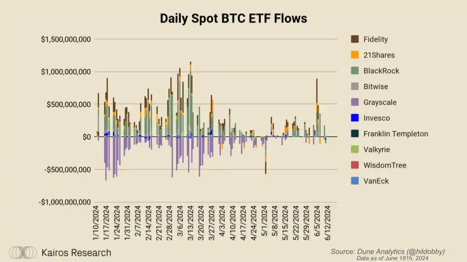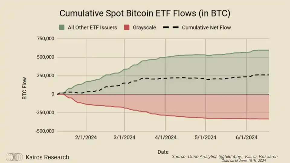 尽管 Grayscale 有大量卖出,但我们仍然看到 ETF 总体上的净流入,无论是美元还是 BTC。