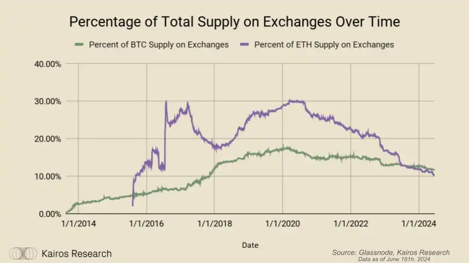 例如,当观察 ETH 的供应时,它显示出在交易所持有的总供应量的百分比持续下降,甚至低于比特币。更有趣的是,交易所的供应下降趋势几乎与 2020 年 5 月 Uniswap v2 的推出完美对齐。