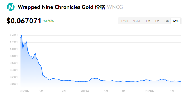 Wrapped Nine Chronicles Gold 当前价格为 $0.067071。Wrapped Nine Chronicles Gold 的价格在过去 24 小时内上涨了 3.31%。目前,Wrapped Nine Chronicles Gold 市值排名为第 261 名,实时市值为 $804.54万,流通供应量为 119,794,315 WNCG,最大供应量为 0 WNCG。我们会实时更新 Wrapped Nine Chronicles Gold/USD 的价格。Wrapped Nine Chronicles Gold 价格表现 (美元)