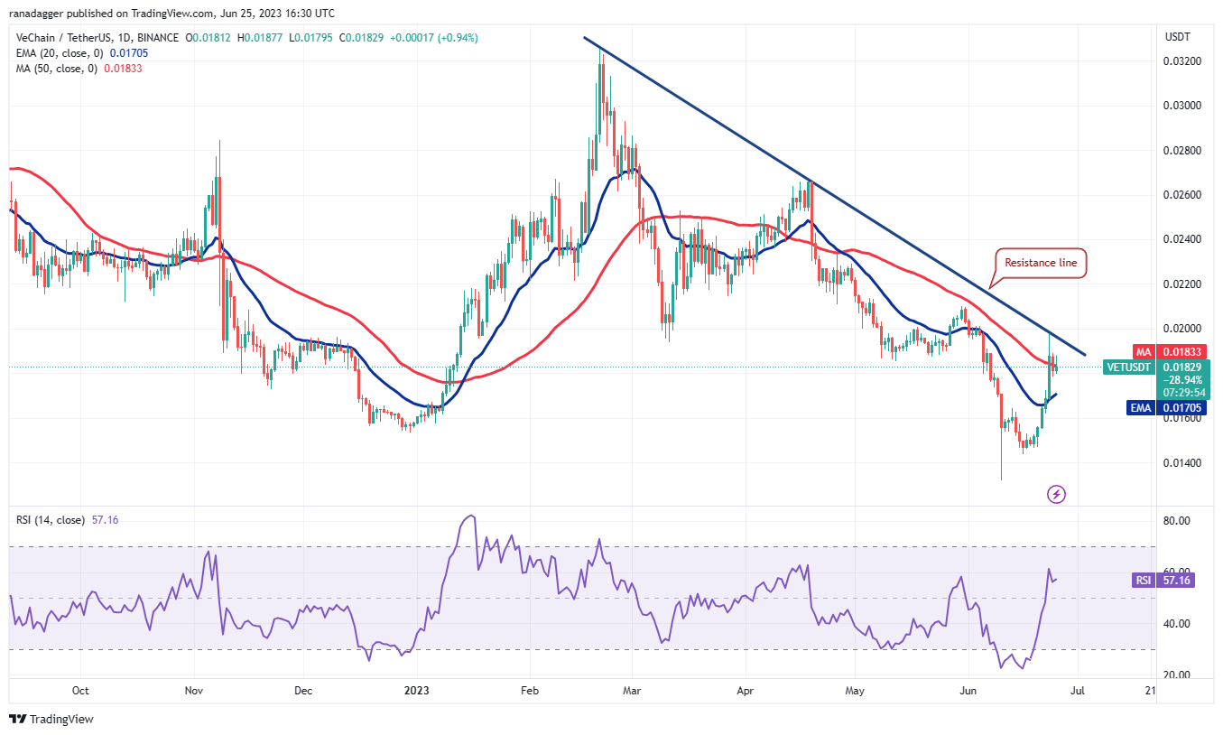 VeChain在6月23日从阻力线回落,但空头正在努力将价格维持在50日移动均线(0.018美元)以下。这表明交易员正在逢低买入。