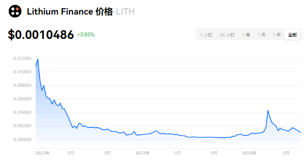 Lithium Finance 当前价格为 $0.0010486。Lithium Finance 的价格在过去 24 小时内上涨了 3.86%。目前,Lithium Finance 市值排名为第 269 名,实时市值为 $661.83万,流通供应量为 6,303,132,231 LITH,最大供应量为 10,000,000,000 LITH。我们会实时更新 Lithium Finance/USD 的价格。Lithium Finance 价格表现 (美元)