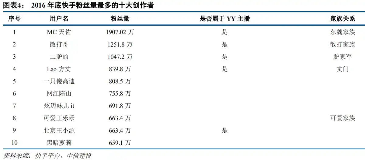 2014 年,拥有一批下沉市场忠实粉丝的 YY 主播入驻快手,那时快手的月活为 100 万。2016 年底,快手月活突破 6400 万,在快手快速发展壮大的这两年里,YY 系主播占据着同期快手头部主播名单的前四名。