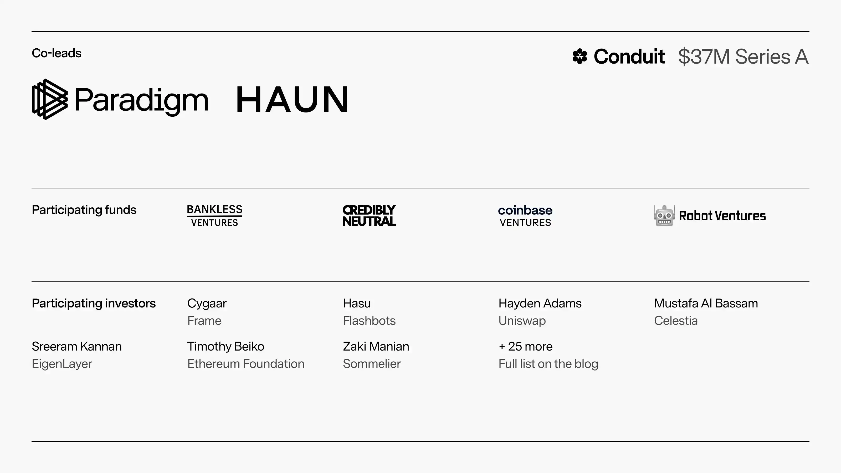 6 月 26 日,Rollup 部署平台 Conduit 宣布完成 3700 万美元 A 轮融资,本轮融资由 Paradigm 和 Haun Ventures 共同领投,Bankless Ventures、Coinbase Ventures 等参投。