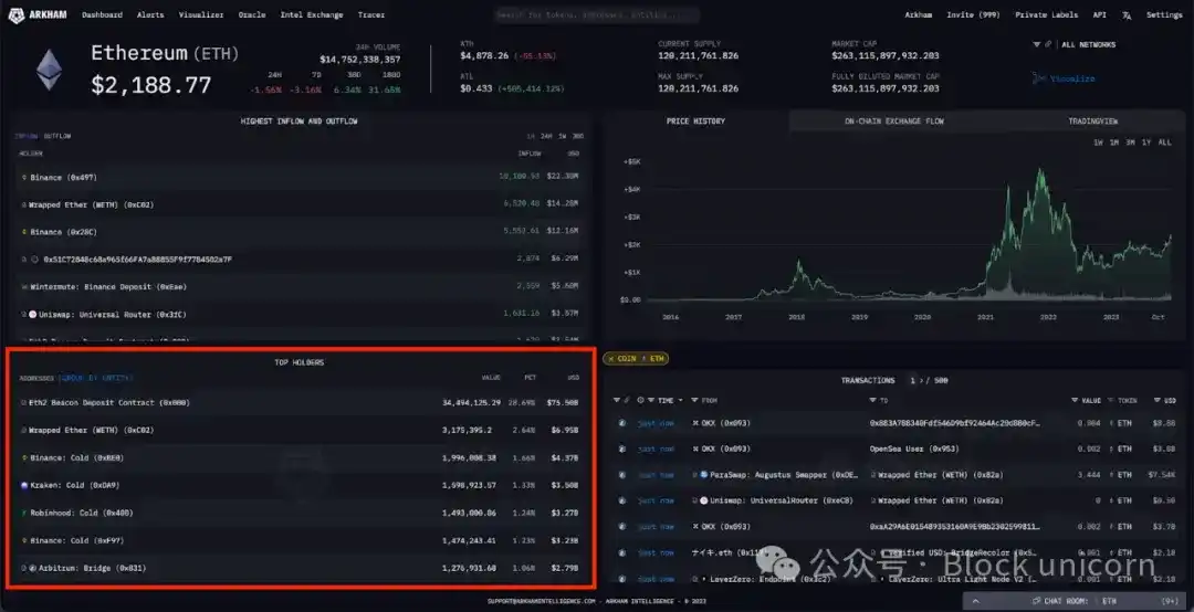 为了评估 Buterin 的 ETH 持有量的重要性,我们将其与其他顶级 ETH 持有者的持有量进行比较。可以通过查看以太坊在 Arkham 的个人档案中的顶级持有者部分,轻松识别持有最多 ETH 代币的实体。