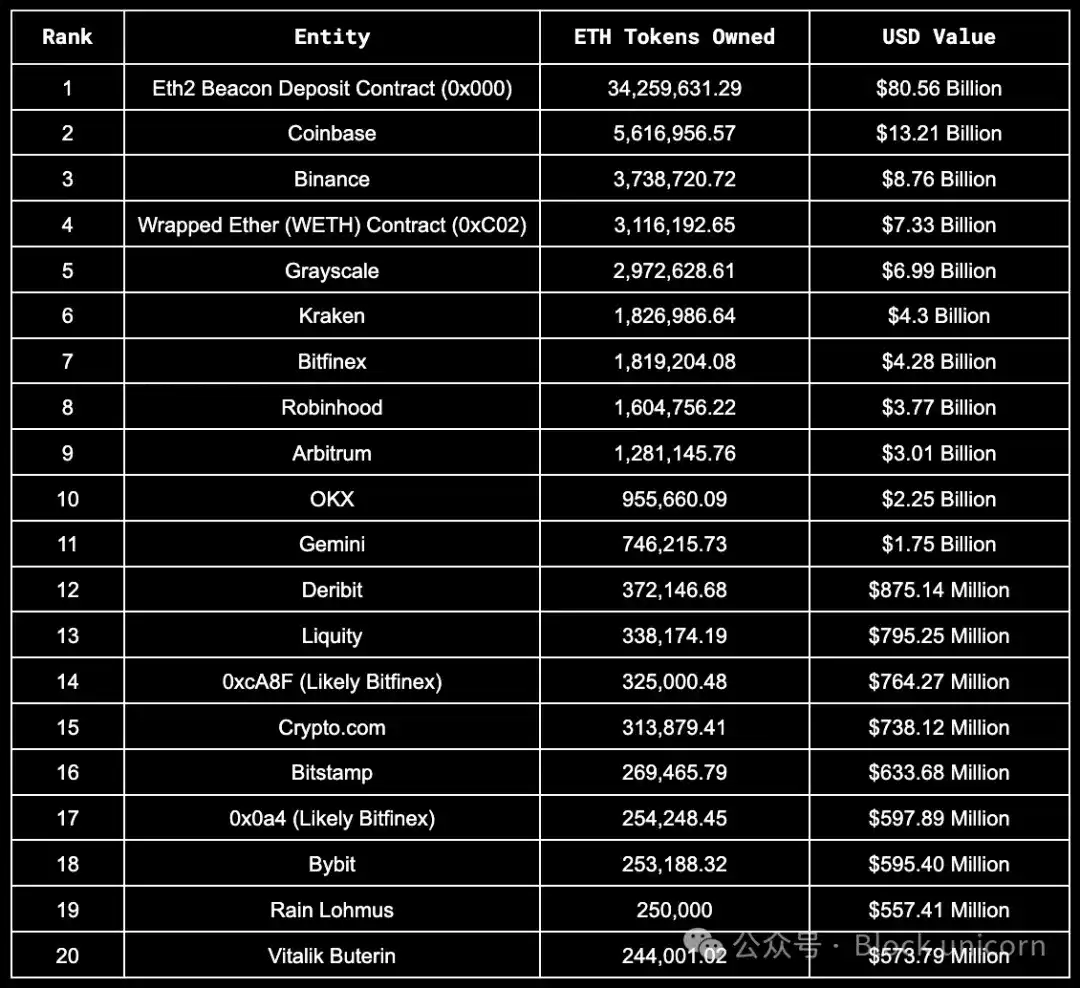 下表显示了截至撰写本文时按实体排名的前 20 名 ETH 持有者: