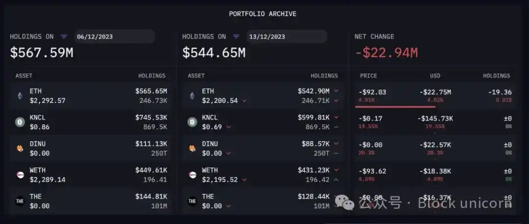 通过查看 Buterin 在 Arkham 个人档案中的投资组合档案,我们可以清楚地看到他多年来已知加密货币持有量的波动情况。下表记录了他每年 12 月 31 日已知的加密货币持有量,作为相应年份的持有量基准。该表还包括 2021 年 11 月 18 日他的估计加密货币净资产,当时 ETH 短暂达到了 4, 891 美元的峰值价格——这将代表 Buterin 已知净资产的峰值。