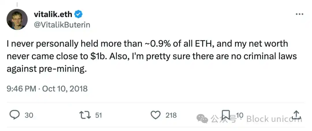 根据 2018 年的一条推文,Buterin 声称他从未持有过超过 ETH 总供应量约 0.9% 的数量。