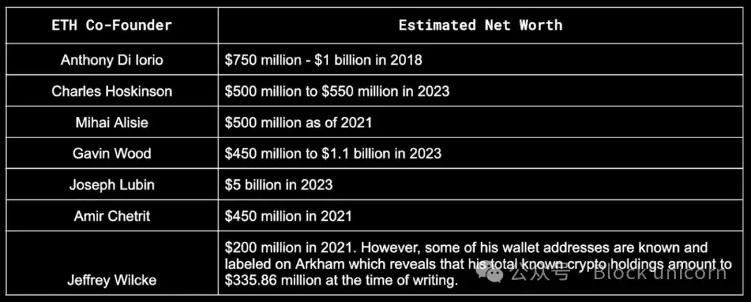 与 Buterin 一样,其他以太坊联合创始人也从他们的 ETH 持有量中获得了财务上的巨大收益。在本节中,我们将 Buterin 的估计净资产与其他以太坊联合创始人的净资产进行比较。对于本节,我们将他的已知加密货币持有量 5.528 6(2024 年 6 月 30 日,现在是价值 8 亿美元)亿美元视为其净资产的全部或大部分,因为我们无法了解他非加密货币持有量的具体规模。