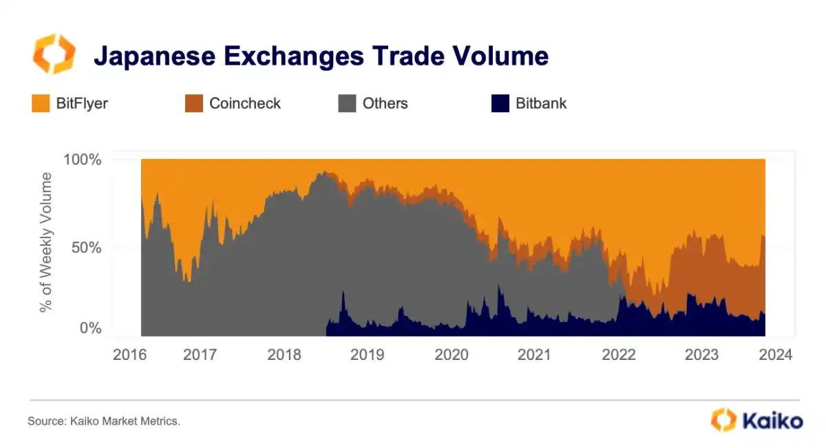 · BitFlyer 是按交易量计算的最大交易所,近年来一直保持其主导地位。