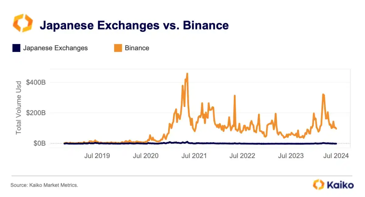 然而,与顶级国际交易所相比,日本的国内交易所交易量几乎没有竞争力。自新冠疫情以来,Binance 已经远远甩开了日本的交易所。