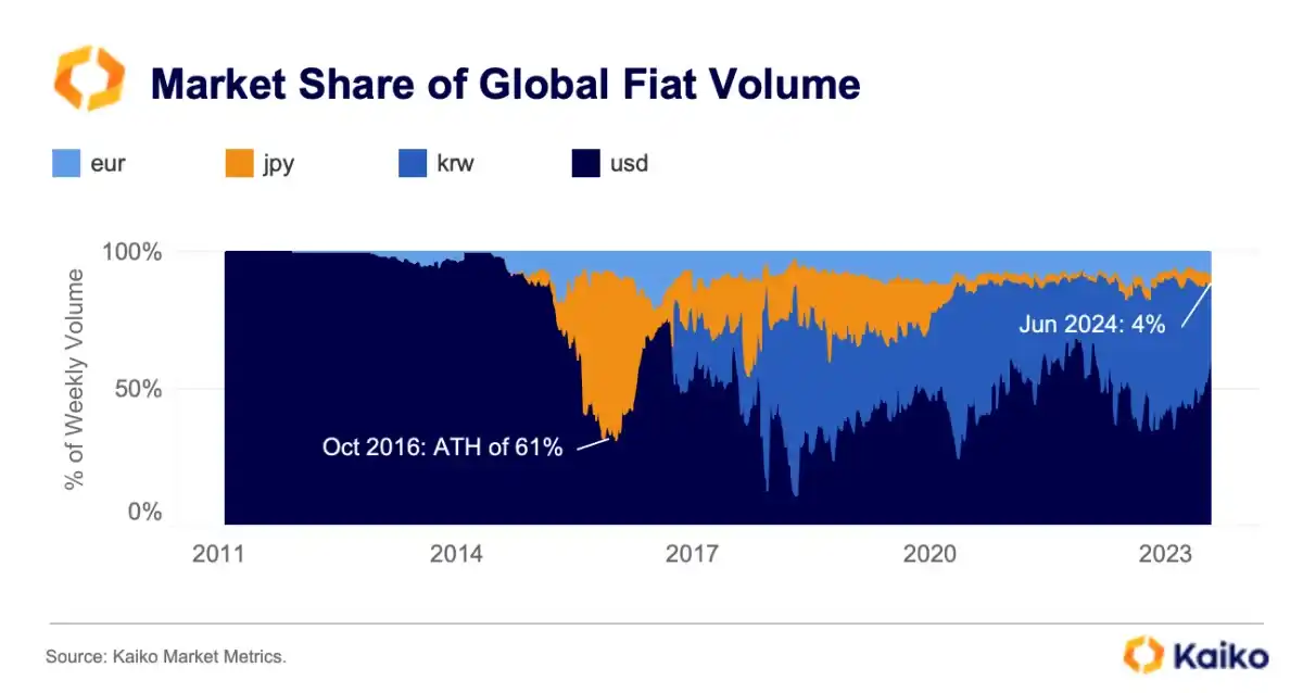 日元的绝对主导地位,一度占所有法币交易量的 60% 以上,在疫情期间迅速消失。然而,亚洲法币交易量的总份额随着交易量从日元转移到韩元而保持相对稳定(图 8)。