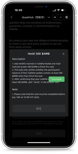此任务需要参与者的钱包账户持有至少 500 枚AMB,参与者可以通过 swap 或者转账的方式完成此任务。确保自己的 AirDAO 钱包地址余额大于 500 枚AMB 后,返回 App 内的任务页面点击「验证」即可。