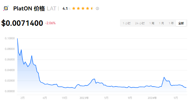 PlatON 当前价格为 $0.0071400。PlatON 的价格在过去 24 小时内下跌了 -2.06%。目前,PlatON 市值排名为第 222 名,实时市值为 $4,207.34万,流通供应量为 5,876,175,585 LAT,最大供应量为 10,250,000,000 LAT。我们会实时更新 PlatON/USD 的价格。PlatON 价格表现 (美元)