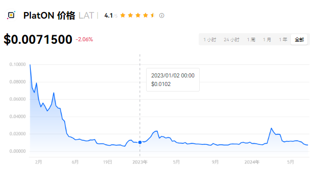 PlatON 当前价格为 $0.0071500。PlatON 的价格在过去 24 小时内下跌了 -2.05%。目前,PlatON 市值排名为第 222 名,实时市值为 $4,201.47万,流通供应量为 5,876,175,585 LAT,最大供应量为 10,250,000,000 LAT。我们会实时更新 PlatON/USD 的价格。PlatON 价格表现 (美元)
