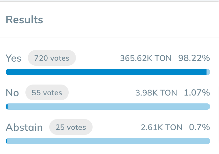 该提案需要得到大多数TON验证者的批准才能生效,启动此功能的全网投票定于6月15日举行,此提案获得高达98.22%的赞成率,最终投票通过。