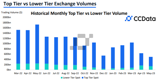 5月CEX现货交易量约4,950亿美元,下跌21.7%,写下2019年3月以来最低的月度交易量。
