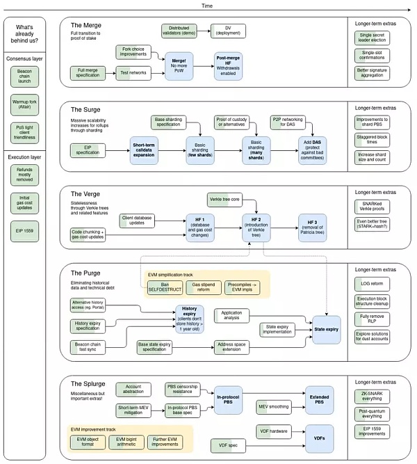 十一月初,Vitalik 在推特上分享了以太坊继完成 The Merge 之后的新版路线图。路线图显示,接下来除了继续完善 The Merge 后续工作(比如质押解锁、分布式验证等等)外,还将逐步推进: