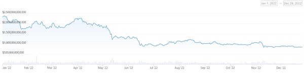 从整体来看,全年加密资产总市值缩水近 1.5 万亿美元。数据显示,总市值从年初的 23340 亿美元下降至目前的 8447 亿美元,跌幅超过 63%;市值首次跌破 1 万亿美元大关是在今年 6 月 14 日,随后持续盘整至今。